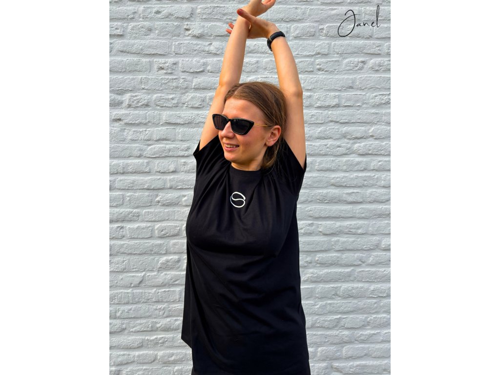 - rovný střih s kulatým žebrovaným výstřihem s dvojitým prošíváním